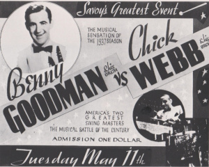 強力になったBGバンドの実力の度合いを示す逸話があります。後々にまで語り草となったその逸話とは、左の告知のようにチック・ウェッブの楽団とのサヴォイでのバンド対決です。BGとバンドはニュー・イングランドへのツアーを終えて、サヴォイ・ボールルームでチック・ウェッブのバンドと顔を合わせることになります。以前拙HPでも書きましたが、チック・ウェッブといえば合戦狂と言われ、バンド合戦で負けたことがないと言われる強者です。しかしてその結果は…?詳しくは「ベニー・グッドマン 1937年」をご覧ください。