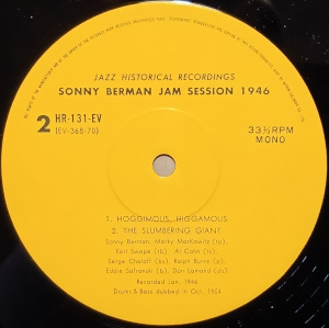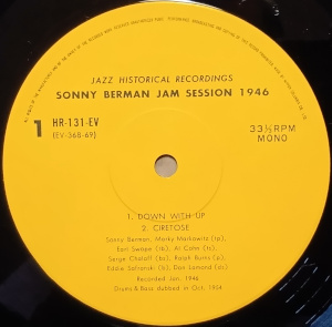 このアルバムは、日本コロンビアから出ていた、日本盤であるが、僕の持っているレコードには、解説が付いておらず、詳しいことが分からない。ただかなりの変則LPであることだけは確かで、1946年1月24日にチャビー・ジャクソンが集めたミュージシャン達のジャム・セッションに、8年後の1954年10月にベースとドラムをオーヴァー・ダヴィングしたものだという。"From spirituals to swing"のジョン・ハモンド氏とは異なり、最初から暴露しているところは買うが。