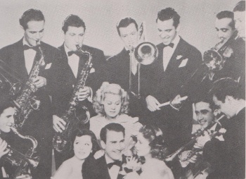 1939年5月ショウ楽団は、「パロマー・ボールルーム」に出演するため、ハリウッドに赴きます。「パロマー・ボールルーム」と言えば、1935年ここでベニー・グッドマンの人気が火を噴き、スイング時代の起爆剤となった場所です。ボールルームからはNBC放送を通じてバンドの演奏は各家庭にも届けられ、また『オールド・ゴールド』というレギュラー・ラジオ・ショウにも出演することになります。さらにショウ楽団は『ダンシング・コ・エド』という映画に初出演を果たします。正にこの時のショウの人気ぶりがよく分かる。左は映画「ダンシング・コ・エド」に出演したショウ・バンド。